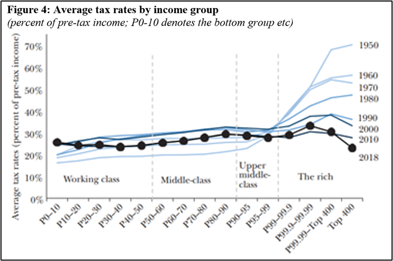 “The US tax system used to be slightly progressive for the bottom 99 percent of the income distribution, but highly progressive within the top 1 percent….In 1950, for example, the top 10 percent, excluding the top 1 percent, paid average taxes rates of around 25 percent, while the top 0.01 percent paid almost 70 percent of its income in taxes. In 2018, the US tax system looks like a giant flat tax that becomes regressive at the very top end”.