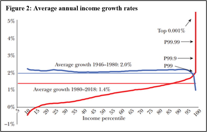 As Figure 2 signals, between 1946 and 1980 pre-tax real income grew at an annual average of about 2% across all segments of the distribution, other than the very top where income growth was slower. However, subsequent to 1980, growth became concentrated in the top 1 percent of the distribution and, within that, in the top 0.01 percent of the distribution. As per Emmanuel Saez and Gabriel Zucman (who constructed the figure), between 1980 and 2018, “for the bottom 50 percent as a whole, growth in pre-tax income [between 1980 and 2018] has been only 0.2 percent per year. Excluding the elderly (aged 65 or more), average bottom 50 percent pre-tax income has declined slightly since 1980.”