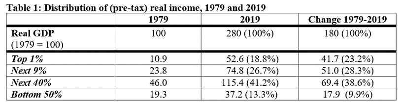 Table 1 compares the distribution of pre-tax income in 1979 and 2019 (data are from the World Inequality Database). Between 1979 and 2019, the US economy almost trebled in size. Over that time, the share of (pre-tax) income accruing to the top 10 percent rose from 34.7 to 45.5 percent (with 8 of the 11 point gain going to the top 1 percent). As the right-hand column of the table signals, 51.5%of the total increment in real income over the 40-year period went to the most affluent 10 percent; less than 10 percent of the gains accrued to the bottom half of the population.