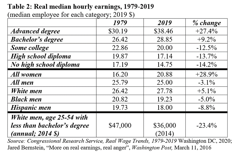 Disaggregating further, Table 2 draws on data from the Congressional Research Service to summarize changes in earnings between 1979 and 2019 for the representative (median) employee, across a variety of employment categories,. Over the 40-year-period, median earnings for employees with an advanced degree increased by 27 percent; for all women, median earnings increased by 28.9%. Men and workers without an advanced degree did not fare well: the median hourly wage for men was stagnant; earnings for the median employee with less than a Bachelor’s degree declined. Combining two sub-groups (the combination is one with particular salience for political economy analysis of America’s current travails…..), between 1979 and 2014, the real earnings of the median white male employee in the 25-54 age range with less than a college degree fell by 23.4 percent.