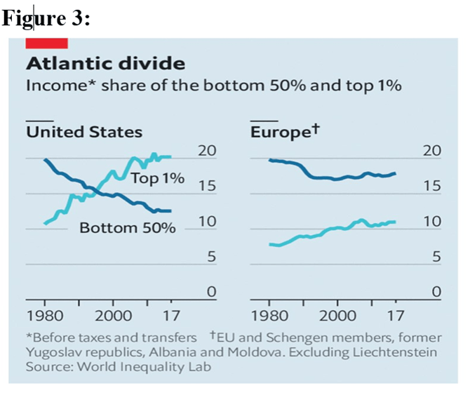 What accounts for the far-reaching distributional changes between 1979 and 2019? The data in Figure 2 and Table 1 are for pre-tax income, so the explanation cannot be found in policy-driven changes in taxes and transfers. Nor do accelerating globalization and far-reaching technological change provide an adequate explanation: Europe also was affected by changes in technology and trade; however, as shown in Figure 3 (published by The Economist, using WID data), its (pre-tax) distributional changes were far more modest.