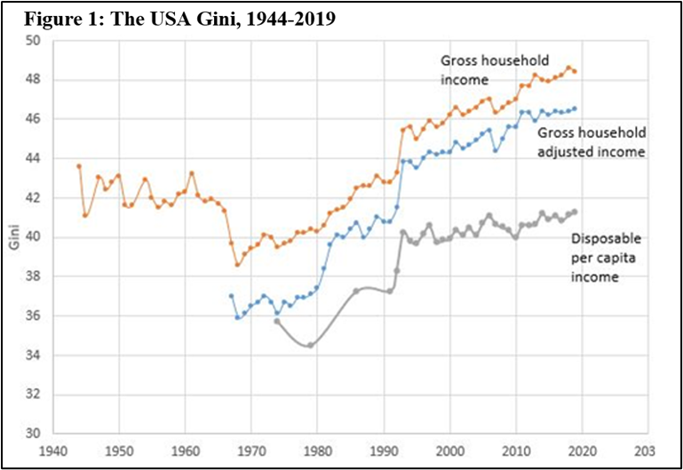 Driven by a combination of globalization, technological changes, policy choices and changes in norms and institutions, the United States economy has undergone far-reaching structural changes and distributional shifts. Figure 1 (from Branko Milanovic, using the LIS data set) provides an overview of the distributional shifts, using the Gini coefficient as the summary measure of inequality (higher being more unequal); it distinguishes between gross inequality (income before taxes and transfers) and net inequality (disposable per capita income). As the figure shows, US inequality has been on the rise since the end of the 1970s.