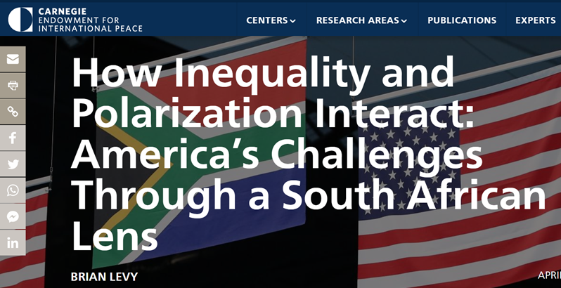 Fueled by hope, I spent the 2010s travelling back-and-forth between South Africa and the USA, sharing an optimistic approach to integrating governance and development strategies with mid-career practitioners at both SAIS and the Mandela School. But the subsequent decade unfolded in unexpectedly toxic ways in both countries. It felt important to complement with-the-grain pragmatism with an exploration of underlying challenges. A 2021 co-authored paper explored why things turned rancid in South Africa. My new paper – How Inequality and Polarization Interact: America’s Challenges Through a South African Lens, also published by the Carnegie Endowment for International Peace – takes a comparative perspective. This post lays out five personal take-aways from the comparison. (Here’s a link to the paper’s executive summary).