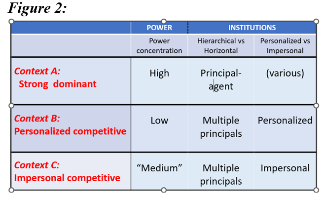 Context B (‘personalized competitive’) – in which authority is fragmented, with multiple centers of power, limited capacity for co-operation, and limited compliance with formal rules.