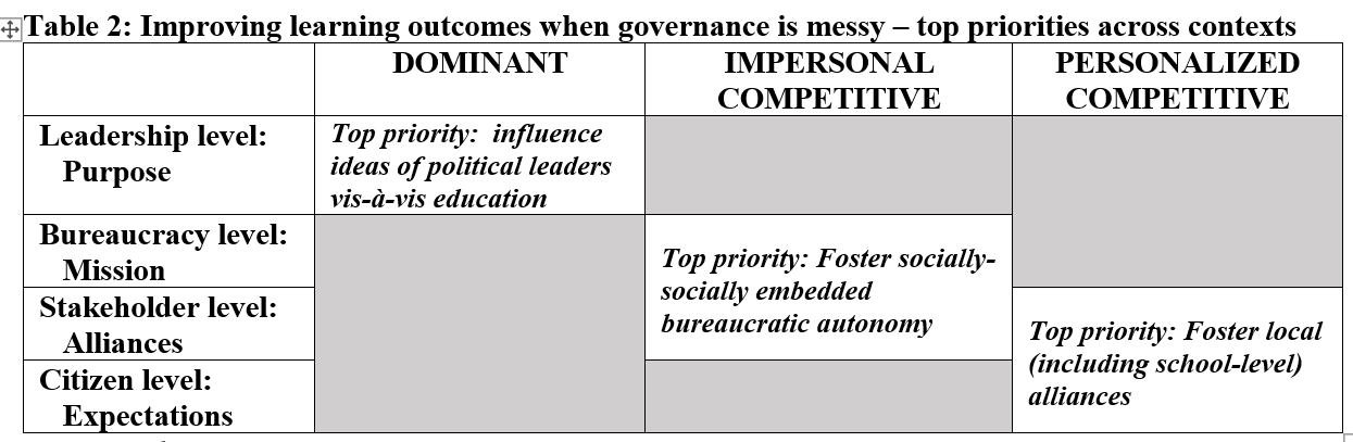 For personalized competitive contexts, contestation among stakeholders invariably leads to policy incoherence, bureaucratic fragmentation, and high risks of predation – and thus little prospect that efforts to strengthen public systems can gain traction. Yet as Table 2 suggests (and as analyses of Bangladesh and Ghana detail), fragmentation can have a silver lining – it can create space for alliances of developmental stakeholders to successfully push back against predatory pressures, and eke out islands of effectiveness at local levels (sometimes even as localized as an individual school). More ambitiously, insofar as a societal expectation of “all for education” can take hold – that parents and communities, especially, have an active role to play in supporting a learning-oriented education system – then, even in personalized competitive contexts, far-reaching national gains in learning outcomes can be achieved. As the synthesis paper details, Kenya offers an example of what is possible.